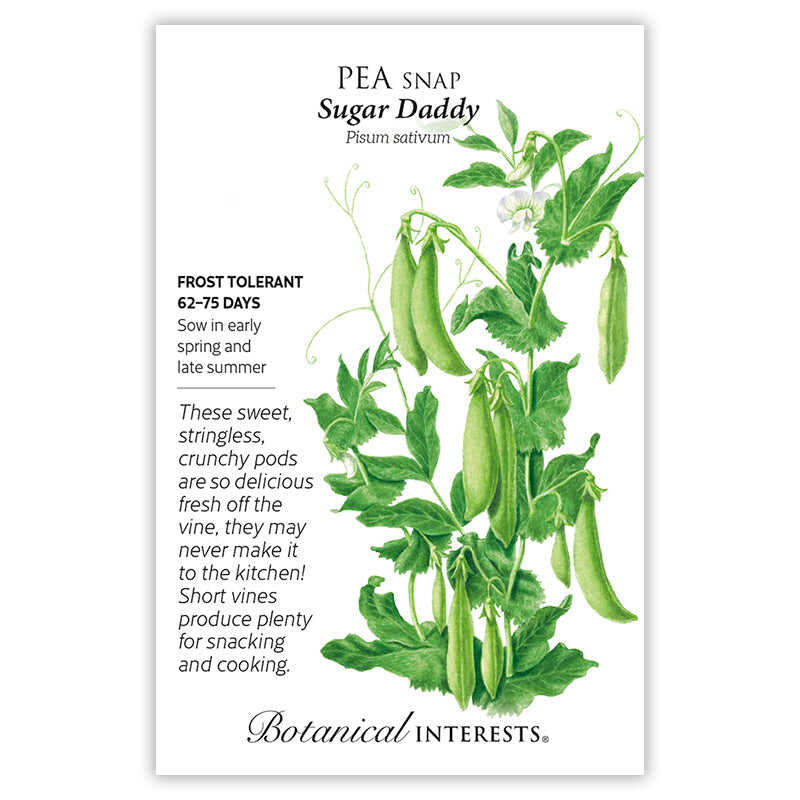 Sugar Daddy' peas were bred by Dr. Calvin Lamborn, the innovative research director that developed the first edible-podded snap pea, 'Sugar Snap'. However, 'Sugar Daddy' has some big improvements—stringless pods, shorter vines, and improved disease resistance. Slender, 3" pods have a deep green color adding to their appeal. The short plants reach only 24"-30" tall and don't need support; a short fence or trellis will make it easier to find and harvest the crunchy peas, though. Pods can be served fresh by themselves or with dip, or added to give crunch to salads. Add to stir-fries and soups or steam for a delicious vegetable. Resistant to powdery mildew and tolerant to bean leaf roll virus.